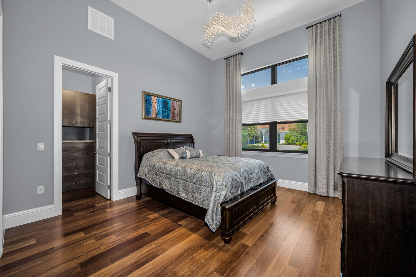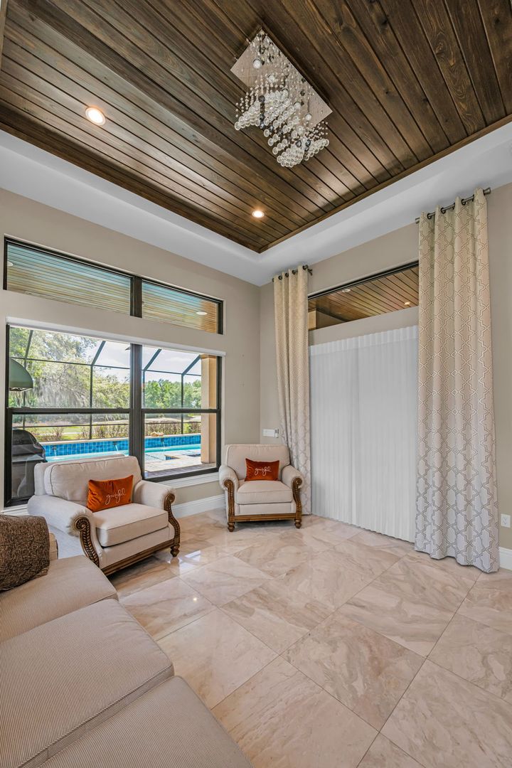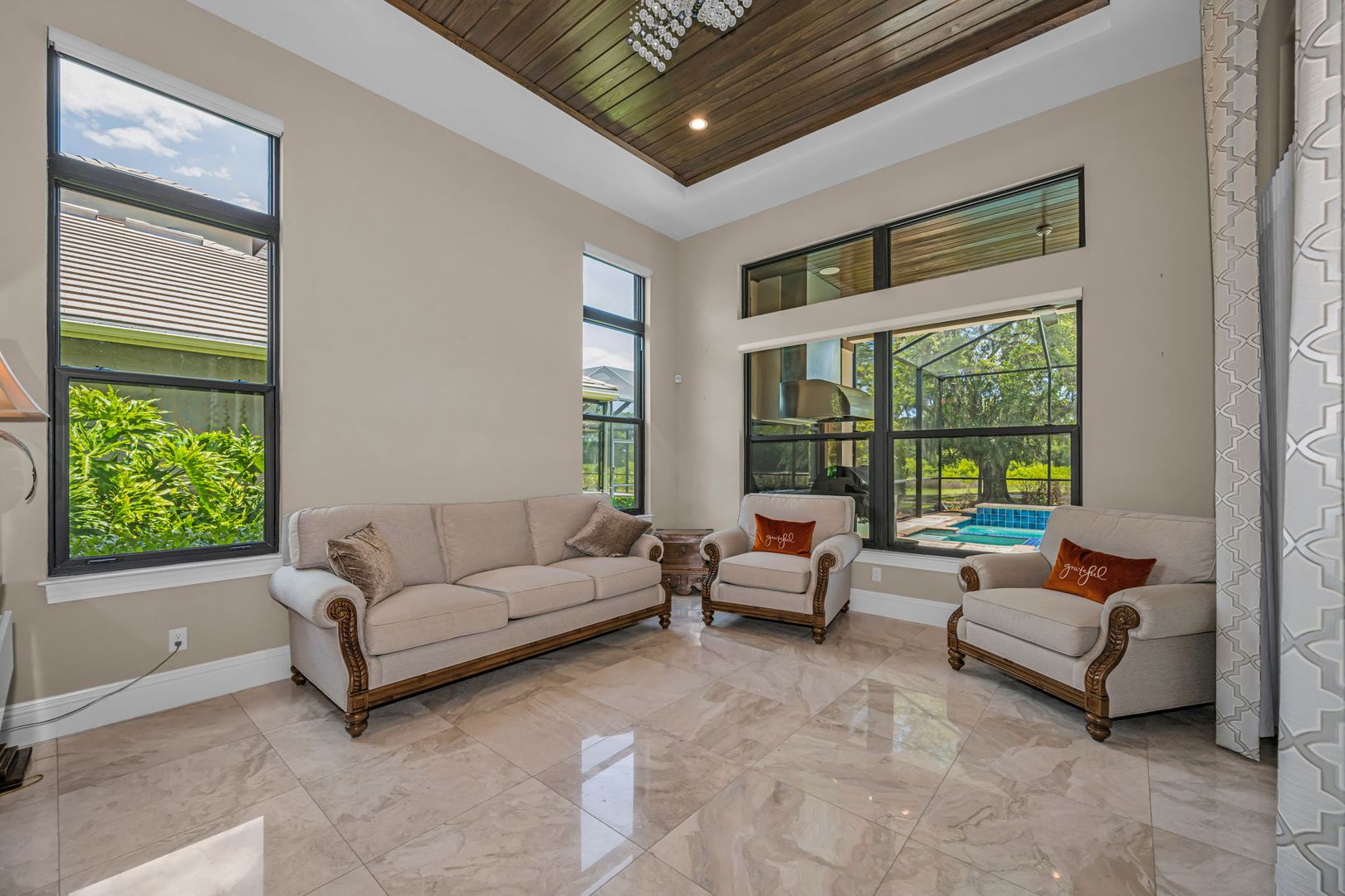 Step outside to a resort-style retreat featuring a screened-in pool with beach entry, elegant paver decking, and a fully equipped outdoor kitchen. A unique wet and dry bar setup completes the space, making it perfect for hosting gatherings or enjoying quiet evenings overlooking the course.
