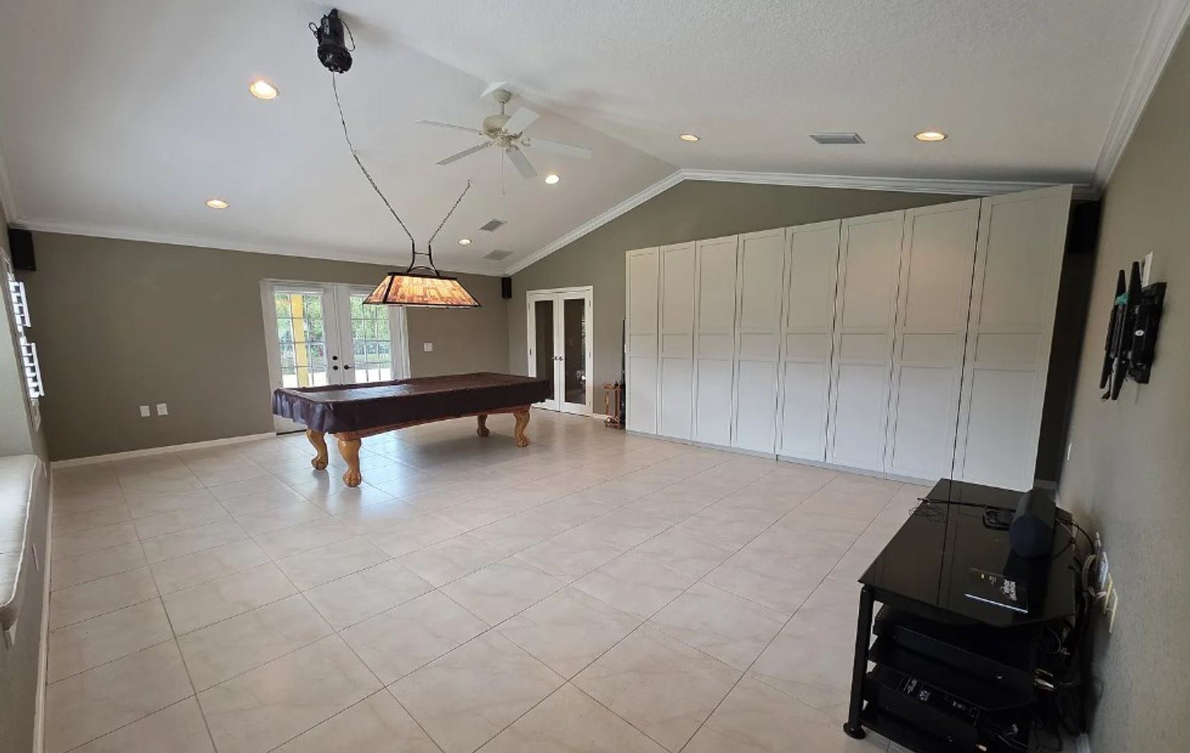 Entertain in the large bonus/game room with 8-ft slate pool table, ceiling fan, and disco ball